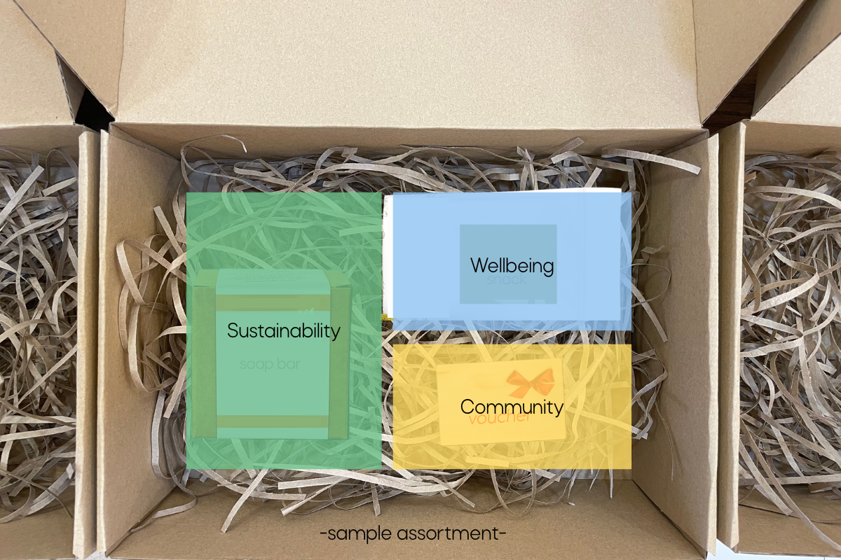 We source items from our local partners, representing each of our three key themes of sustainability, wellbeing and community. For example, you can expect a gift set to contain one item from a sustainability-related brand, another item that focuses on wellbeing, and one item that supports our community. The contents may include a mix of food items, lifestyle products, and brand vouchers.